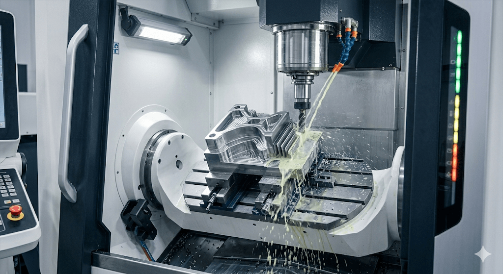 A spinning cutter chips away at raw stock, guided by coded directions across three dimensions. Movement happens left to right, front to back, up and down, step by careful step.
